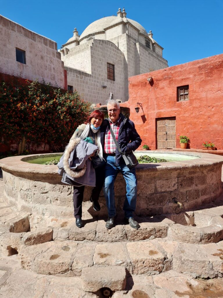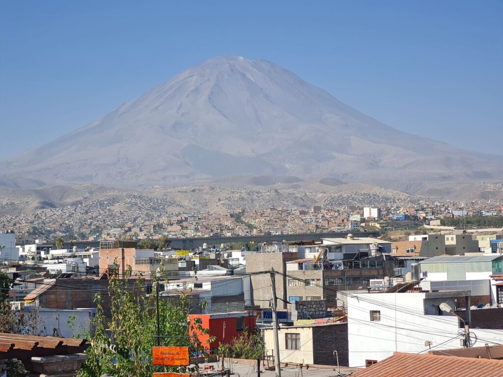 Volamos desde Lima en un vuelo de hora y media. Arequipa, la segunda ciudad más poblada de Perú, me enamoró con sus calles, monumentos, volcanes y gastronomía. Nos alojamos en el *Swiss Perú Hostel* (70 soles la noche, con desayuno incluido).