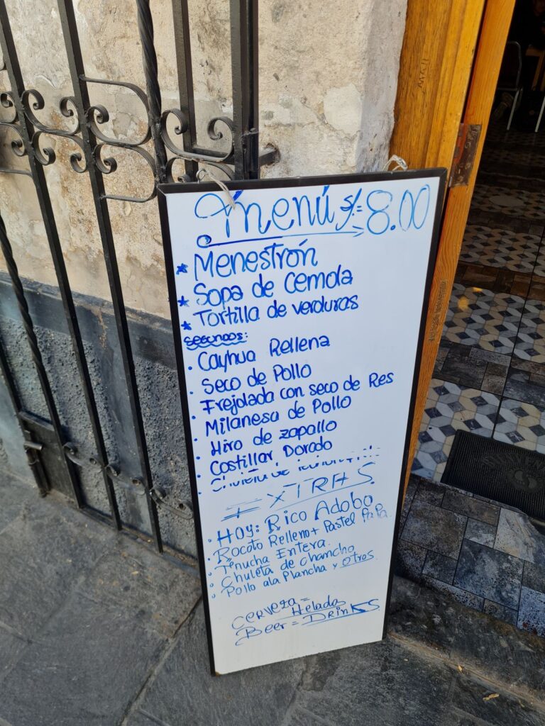 Paseando por Arequipa vi un cartel en la puerta de un restaurante donde se anunciaba un menú por 8 soles. Me llamó la atención y entré para probarlo. Pedí tortilla de verdura con tallarines y caigua rellena. Estaban bien cocinados y salí satisfecho. No entraba en el precio ni la bebida ni el postre pero qué más se puede pedir por 8 soles (2 euros al cambio).