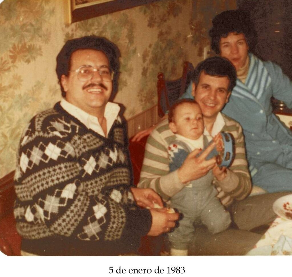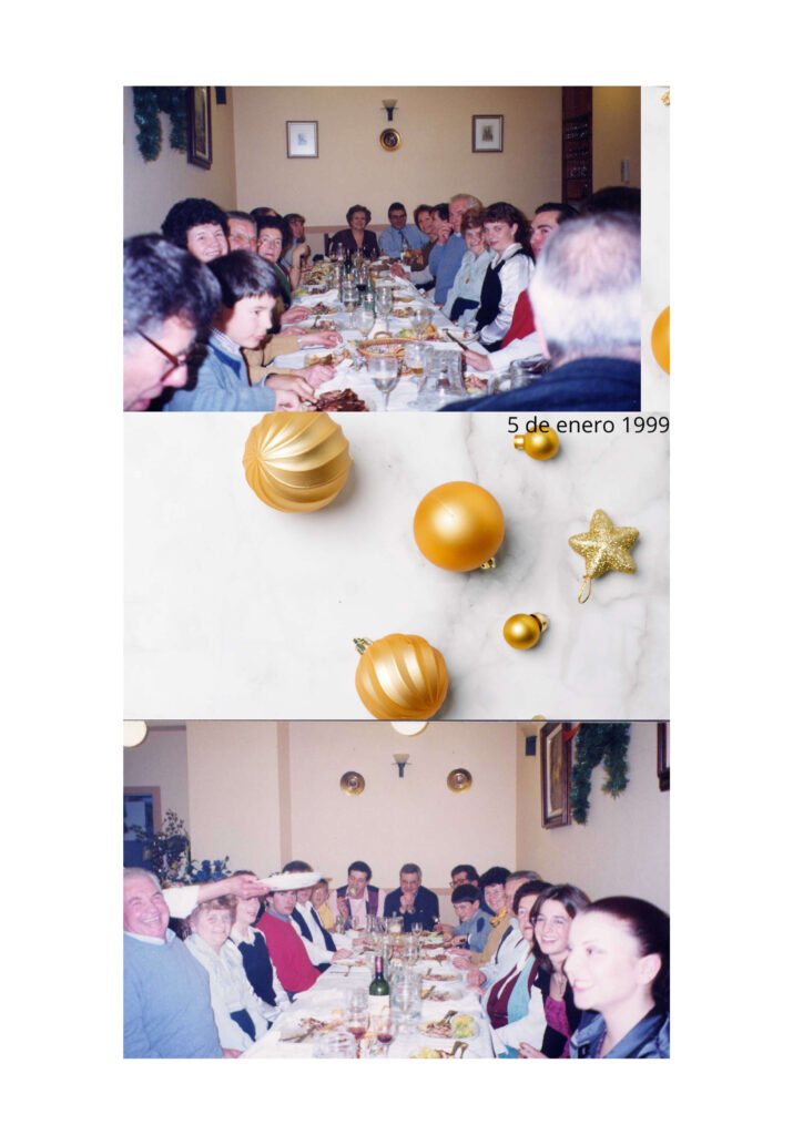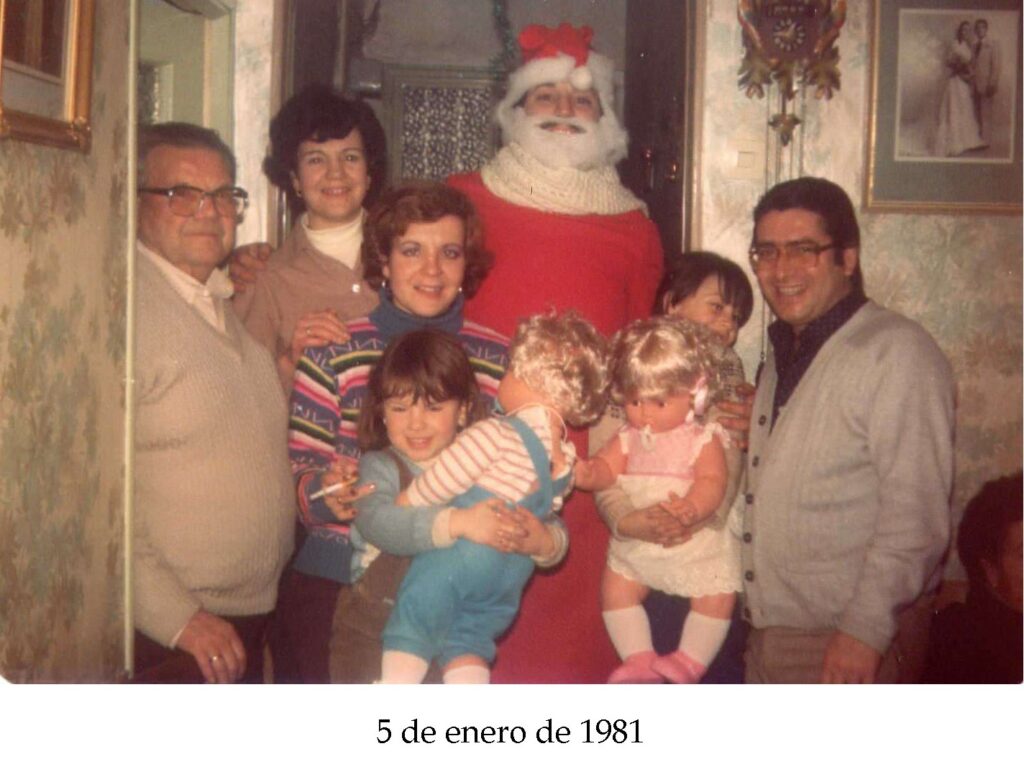 Los recuerdos se mezclan con mis nochebuenas, que fueron tantas veces en esa misma casa: el olor a sopa de marisco, a cordero, a bengalas, aquella enorme caja de roscón. La noche brilla en mi recuerdo con las risas graves del tío Luis o del tío Manolo, y con las bromas agudas y subidas de tono de algunas de las tías y de las primas mayores. De fondo, siempre la presencia discreta pero firme del abuelo, la gracia y complicidad de la abuela, la protección atenta de mis padres, los abrazos de Mari Paz y Susana. Ser el pequeño tenía el inconveniente de ser más asustadizo, junto a unos primos que crecían en picardía más rápido que el único hijo único. Y poco a poco recuerdo empezar a captar las preguntas y comentarios incómodos, y que fueron alimentando mi propio criterio.